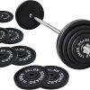 - Plates are made of solid cast iron with a 1-inch center hole fits any Standard bar with diameter 1” or less; Can be used with 1” dumbbell bars too