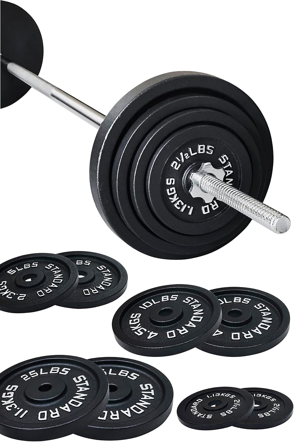- 95 pounds set: 1x 5 feet Standard Barbell with Star Locks (10 lbs), 2x 2.5lb, 2x 5lb, 2x 10lb, 2x 25lb cast iron plates